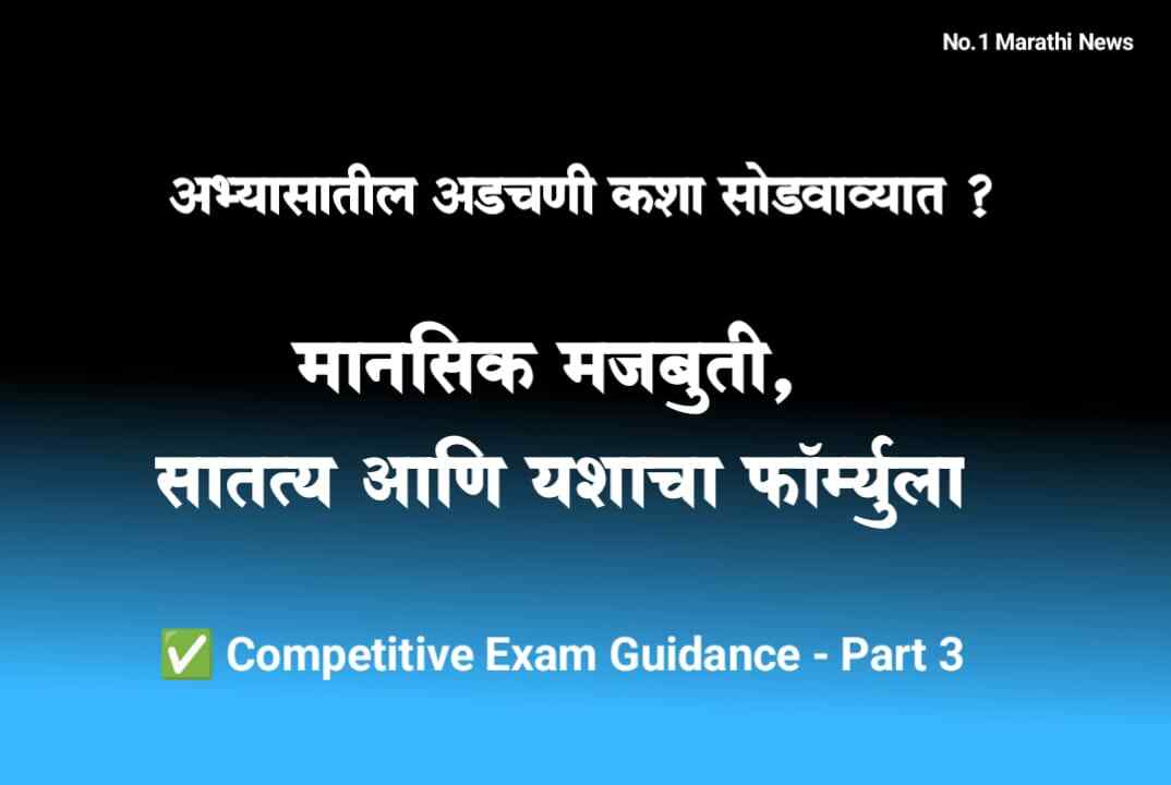 ✅ स्पर्धा परीक्षा मार्गदर्शन – भाग 3 ✅ Competitive Exam Guidance – Part 3 अभ्यास असूनही यश का मिळत नाही ?अनेक विद्यार्थी दिवस-रात्र अभ्यास करतात, क्लासेस लावतात, नोट्स बनवतात… तरीही अपेक्षित यश मिळत नाही. मग प्रश्न पडतो – “इतका अभ्यास करूनही यश का मिळत नाही?”याचं उत्तर फक्त अभ्यासात नसून – ✅ मानसिक तयारी ✅ योग्य नियोजन ✅ सातत्य ✅ आत्मविश्वास ✅ स्ट्रेस मॅनेजमेंट या सगळ्यांमध्ये लपलेलं असतं.या भाग 3 मध्ये आपण अभ्यासातील अडचणी, नैराश्य, भीती, अपयश, आत्मविश्वासाची कमतरता आणि त्यावर उपाय सविस्तर पाहणार आहोत.✅ 1) स्पर्धा परीक्षेतील सर्वात मोठा शत्रू – “भीती”🔹 भीती कशाची?अपयशाची भीतीवय वाढत चालल्याची भीतीघरच्यांच्या अपेक्षांची भीतीमित्र यशस्वी होत असल्याची भीतीही भीती तुमच्या अभ्यासावर अदृश्य ब्रेक लावते.✅ उपाय:✅ “मी करणारच” ही मानसिकता ठेवा ✅ रोज 5 मिनिटं स्वतःशी सकारात्मक संवाद करा ✅ नकारात्मक लोकांपासून अंतर ठेवा ✅ सोशल मीडिया तुलनात्मक पोस्ट टाळा✅ 2) अभ्यासात मन न लागणे – कारणे आणि उपाय🔹 प्रमुख कारणे:मोबाईलचा अति वापरसोशल मीडिया अॅडिक्शनचुकीची टाइम टेबलझोपेचा अभाव✅ उपाय:✅ मोबाईल अभ्यासाच्या खोलीबाहेर ठेवा ✅ Pomodoro Technique (25 मिनिट अभ्यास + 5 मिनिट ब्रेक) वापरा ✅ रात्री किमान 7 तास झोप ✅ सकाळी थोडासा व्यायाम ✅ 3) अपयश आल्यानंतर खचणे – हे नैसर्गिक आहे, पण…स्पर्धा परीक्षेत अपयश हे शंभर टक्के हमखास येतंच ! पण फरक एवढाच असतो – ❌ काही लोक थांबतात ✅ काही लोक पुढे जातात✅ यशस्वी लोकांचं गुपित:ते अपयशातून शिकतातते स्वतःला दोष देत बसत नाहीतते पुन्हा नव्या जोमाने सुरुवात करतात👉 लक्षात ठेवा: “तुमचं अपयश तुम्हाला परिभाषित करत नाही – तुमची चिकाटी करते.” ✅ 4) सातत्य (Consistency) – यशाचा खरा गुरुमंत्र🔹 1 दिवस 10 तास अभ्यास > ❌🔹 100 दिवस रोज 2 तास अभ्यास > ✅सातत्य म्हणजे रोज थोडा-थोडा अभ्यास, पण खंड न पाडणे.✅ सातत्य टिकवण्यासाठी:✅ Daily Study Tracker ठेवा ✅ आजचा अभ्यास आजच पूर्ण करा ✅ “आज नाही, उद्यापासून” हा शब्द काढून टाका ✅ 5) मानसिक तणाव (Stress) कसा कमी करायचा?स्पर्धा परीक्षेचा प्रवास म्हणजे – 📘 अभ्यास 😓 ताण 😴 थकवा 😞 नैराश्यहे सगळं येतंच.✅ तणाव कमी करण्याचे 7 सोपे मार्ग:✅ दररोज 10 मिनिट प्राणायाम ✅ 5 मिनिट ध्यान (Meditation) ✅ आठवड्यातून 1 दिवस पूर्ण विश्रांती ✅ निसर्गात चालणे ✅ आवडते संगीत ✅ विश्वासू व्यक्तीशी मन मोकळं बोलणं ✅ स्वतःला दोष न देणं ✅ 6) “मी हुशार नाही” ही सर्वात मोठी चूकअनेक विद्यार्थी स्वतःबद्दल असं म्हणतात – ❌ “मी हुशार नाही” ❌ “माझ्याकडून होणार नाही” ❌ “माझं नशिबच खराब आहे”👉 ही सगळ्यात धोकादायक मानसिकता आहे.✅ सत्य काय आहे?✅ हुशारी जन्मजात नसते – ती घडवावी लागते ✅ यश नशिबाने नाही – कष्टाने मिळते ✅ तुमच्यात सर्व काही आहे – फक्